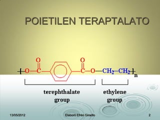 El documento describe diferentes tipos de polímeros, incluyendo polietileno tereftalato (PET), polietileno de alta densidad (HDPE) y polietileno de baja densidad (LDPE). Explica que el PET se usa comúnmente en botellas de bebidas y envases, mientras que el HDPE y el LDPE tienen una amplia gama de aplicaciones como bolsas, frascos y tuberías debido a sus propiedades de resistencia y flexibilidad respectivamente.