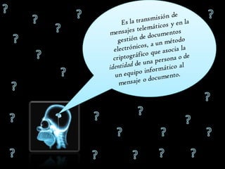 Las normas TS 101 733 y TS 101 903 definen dos formatos para la firma electrónica: PKCS#7 para el formato clásico y XML-Dsig para firma XML. Para verificar una firma electrónica, el receptor aplica la clave pública del emisor al mensaje firmado para descifrarlo y comparar la huella resultante con la del mensaje original, garantizando que no fue modificado y que proviene del firmante. El comercio electrónico permite la compra y venta de productos y servicios en línea a través de canales como Internet, dando ac