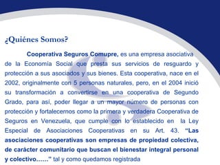 La cooperativa Seguros Comupre ofrece servicios de seguros a sus asociados. Comenzó en 2002 con 5 personas y se transformó en 2004 en una cooperativa de segundo grado para llegar a más personas. Siguiendo los principios cooperativos, busca el bienestar de sus asociados ofreciendo protección a través de seguros de vida, accidentes, enfermedades, vehículos, patrimonio y más.