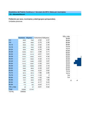 Este documento presenta datos demográficos de la población del municipio de Alicante en España a 1 de enero de 2013, desglosados por sexo y grupo de edad quinquenal. La población total era de aproximadamente 335,052 personas, con una ligera mayoría femenina. La distribución de la población era más equilibrada entre los grupos de edad más jóvenes, pero había una mayor proporción de mujeres entre los grupos de mayor edad.
