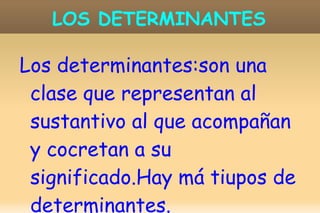 Los determinantes son una clase gramatical que acompañan a los sustantivos y concretan su significado. Existen varios tipos de determinantes como artículos, demostrativos, posesivos, numerales e indefinidos. Los artículos pueden ser definidos o indeterminados, los demostrativos indican cercanía, distancia o lejanía, los posesivos expresan pertenencia y los numerales indican cantidad o orden.