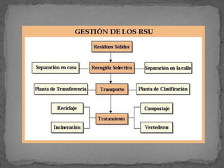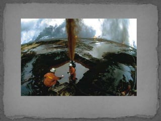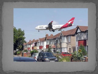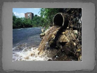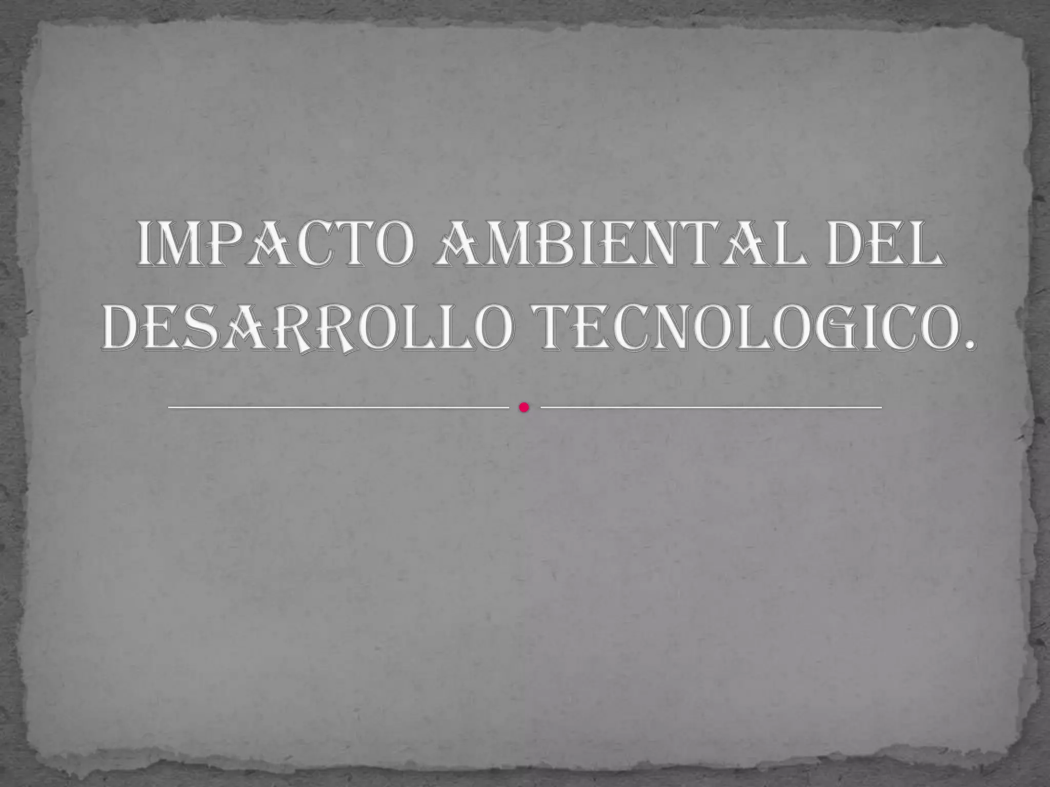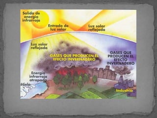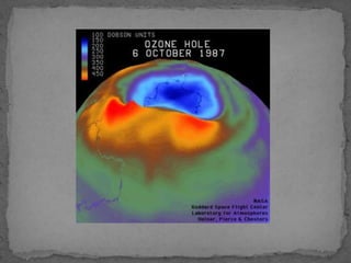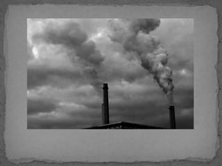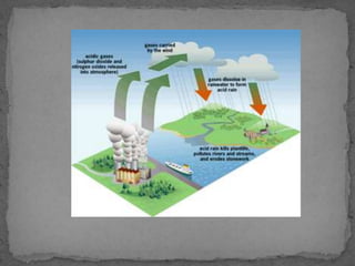 El documento describe varios tipos de contaminación ambiental causados por el desarrollo tecnológico, incluyendo la lluvia ácida causada por emisiones de dióxido de azufre y óxidos de nitrógeno, el agujero en la capa de ozono causado por emisiones de ciertos gases, y el efecto invernadero causado por emisiones de dióxido de carbono y metano. También se mencionan la contaminación del suelo y las aguas por residuos y la contaminación acústica causada por r