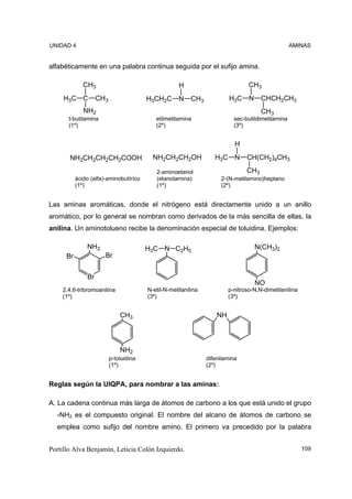 Este documento trata sobre las aminas, compuestos orgánicos derivados del amoniaco con uno o más grupos sustituidos en el átomo de nitrógeno. Describe las características estructurales y nomenclatura de las aminas alifáticas y aromáticas, así como sus propiedades físicas como su polaridad, solubilidad y capacidad de formar puentes de hidrógeno. También cubre compuestos heterocíclicos de nitrógeno importantes y la basicidad de las aminas.