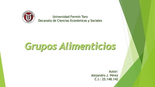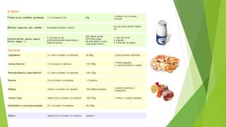 El documento explica los diferentes grupos alimenticios y sus beneficios para la salud, incluyendo las raciones recomendadas. Señala que una buena alimentación es fundamental para llevar una vida saludable y duradera. Explica cada grupo alimenticio como leche y derivados, carnes y huevos, frutas y verduras, alimentos feculentos y azucarados, materias grasas, bebidas y resume la relación entre alimentación y salud, destacando que no existe una dieta ideal sino que depende de factores individuales.