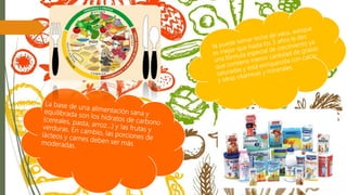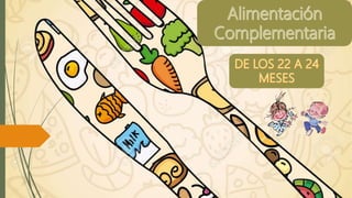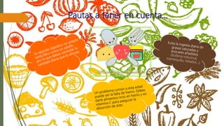 El documento discute las recomendaciones actuales sobre la alimentación complementaria para niños. Se recomienda la lactancia materna exclusiva hasta los 6 meses y que los nuevos alimentos se introduzcan gradualmente a partir de los 6 meses. Los niños entre 1 y 2 años deben recibir 5-6 comidas variadas por día que incluyan diferentes grupos de alimentos.