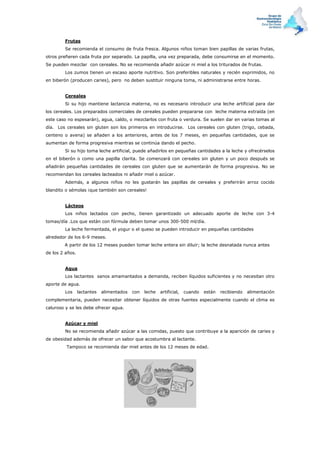El documento habla sobre la alimentación complementaria en el primer año de vida. Recomienda introducir alimentos complementarios a partir de los 6 meses además de la leche, de forma progresiva para detectar posibles alergias. Sugiere empezar con alimentos ricos en hierro como la carne y ofrecer verduras, frutas, pescado, huevos, cereales y lácteos de forma gradual y adaptada al ritmo de cada niño. Además, destaca que la leche debe seguir siendo el principal alimento en el primer año.