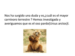 El oso pardo es el mayor carnívoro terrestre en la península ibérica. Aunque come carne, también se alimenta de hierbas, insectos y frutos secos. Su dieta varía según la estación, comiendo más hierbas en primavera y verano, y dependiendo de frutos secos y una dieta más carnívora en invierno cuando las hierbas escasean.