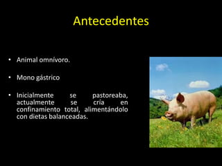 Este documento describe los aspectos básicos de la alimentación de cerdos, incluyendo las necesidades nutricionales en cada etapa de producción. Los cerdos requieren proteínas, energía, vitaminas, minerales y agua en cantidades que varían según su edad y fase productiva. Asimismo, se detallan los principales ingredientes utilizados en la alimentación porcina como granos, subproductos y forrajes.