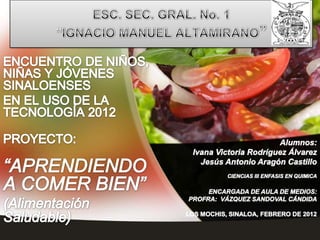 Este documento presenta una guía sobre una alimentación saludable basada en el "plato del bien comer", dividiendo los alimentos en tres grupos (verduras y frutas, cereales y tubérculos, legumbres y alimentos de origen animal) y recomendando opciones para cada comida. También describe los problemas de salud que puede causar una mala alimentación e incluye consejos sobre una vida saludable como beber agua, hacer ejercicio y modificar los hábitos alimenticios.