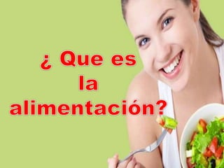 Este documento describe los principios de una alimentación saludable, incluyendo que debe ser variada, equilibrada y completa para proporcionar todos los nutrientes necesarios. Explica que una dieta saludable puede prevenir enfermedades como la obesidad, diabetes y enfermedades cardiovasculares. Además, recomienda incluir frutas, verduras, legumbres y cereales integrales, y limitar la sal y las carnes rojas.