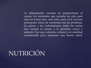 Este documento trata sobre la importancia de una alimentación saludable y equilibrada. Explica que una dieta balanceada debe incluir proteínas, grasas, carbohidratos, vitaminas, minerales y fibra de una variedad de alimentos como verduras, frutas, cereales, carnes y lácteos. También advierte sobre los riesgos de un consumo excesivo de grasas, azúcares, sodio y alcohol. El objetivo final es promover un estilo de vida saludable a través de una alimentación nutritiva y moderada.