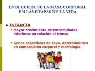 El documento resume las etapas de desarrollo del cuerpo humano desde la infancia hasta la adultez, incluyendo cambios en la composición corporal, requerimientos nutricionales y la importancia de una alimentación balanceada y actividad física. Explica cómo la masa corporal, distribución de grasa y músculo varían a lo largo de la vida y entre hombres y mujeres. También destaca la importancia de evaluar más que solo el peso para medir el estado nutricional.