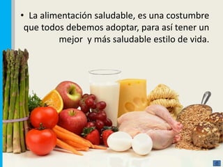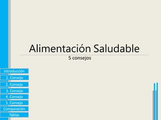 Este documento proporciona 5 consejos para una alimentación saludable: comer alimentos variados, basar la dieta en alimentos ricos en hidratos de carbono, consumir muchas frutas y verduras, comer raciones moderadas y beber muchos líquidos. También compara las ventajas de una dieta saludable frente a una dieta basada en comida chatarra, señalando que la primera aporta mayores nutrientes y la segunda puede producir enfermedades.
