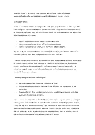 Este documento describe las estrategias clave para mantener una dieta saludable, incluyendo establecer horarios regulares para comidas en familia, servir una variedad de alimentos nutritivos, dar buen ejemplo con una dieta propia saludable, evitar peleas por la comida, e involucrar a los niños en la planificación y preparación de comidas. Siguiendo estas estrategias, las familias pueden formar hábitos alimenticios positivos en los niños y mejorar su salud a largo plazo.