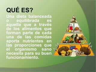Una dieta balanceada consiste en consumir los diferentes grupos de alimentos en las proporciones adecuadas para obtener todos los nutrientes necesarios. Los alimentos contienen macronutrientes como carbohidratos, proteínas y grasas, y micronutrientes como vitaminas y minerales. Se recomienda incluir alimentos de cada grupo principal como lácteos, carnes, huevos, legumbres, frutas y verduras, y granos. Una dieta desequilibrada puede causar problemas de salud.
