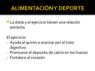 El documento discute la relación entre la dieta, el ejercicio y el desempeño atlético. Explica que el ejercicio y una dieta saludable son cruciales para alcanzar el máximo desempeño deportivo y obtener beneficios para la salud como mejorar la función cardiovascular y perder peso. También describe los principales tipos de ejercicio, parámetros como la frecuencia e intensidad, y los macronutrientes que el cuerpo usa como combustible durante el ejercicio.