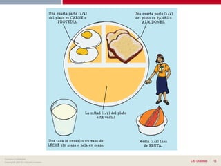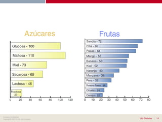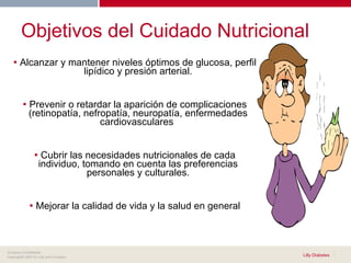 Este documento presenta los objetivos y consideraciones clave para el cuidado nutricional de pacientes con diabetes. Los objetivos incluyen alcanzar niveles óptimos de glucosa, lípidos y presión arterial, prevenir complicaciones y cubrir las necesidades nutricionales individuales. Un plan de alimentación equilibrado debe ser individualizado considerando factores como la edad, peso, actividad física, cultura y complicaciones de salud. Se recomienda que los carbohidratos compongan entre el 50-60% de la dieta, las proteínas el 15-20%