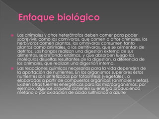 Los organismos obtienen nutrientes de diferentes formas: las plantas realizan la fotosíntesis para sintetizar compuestos orgánicos a partir de sales minerales y energía solar, mientras que los animales y hongos dependen de compuestos orgánicos que obtienen de otras especies a través de la digestión o absorción externa de enzimas. Los microorganismos también obtienen energía de fuentes como el metano o la oxidación de azufre. Los animales cumplen roles ecológicos como depredadores o presas dependiendo de
