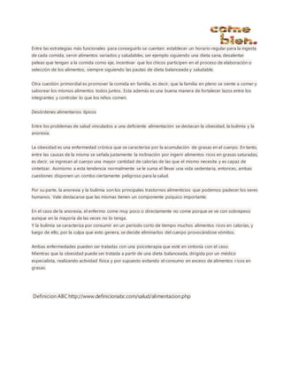 El documento describe la alimentación como el proceso mediante el cual los seres vivos consumen alimentos para obtener nutrientes y energía necesarios para vivir. Explica que los humanos han transformado la alimentación en una actividad social que involucra compartir experiencias, y han desarrollado instrumentos y espacios especializados para la alimentación. También describe algunos desórdenes alimenticios comunes como la obesidad, la bulimia y la anorexia, y sus causas y tratamientos.
