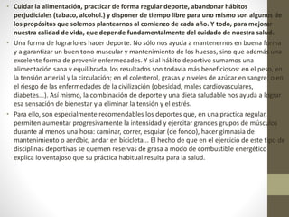 Este documento describe los beneficios de mantener una dieta saludable y hacer ejercicio regular para mejorar la calidad de vida y la salud. Practicar deportes aeróbicos de forma regular, como caminar o correr, ayuda a quemar grasa y prevenir enfermedades. Una alimentación equilibrada que incluya hidratos de carbono, proteínas y grasas saludables, junto con la práctica regular de ejercicio, proporciona múltiples beneficios para la salud como control del peso, la presión arterial y los niveles de