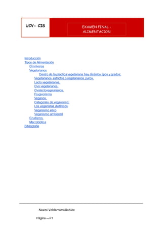 Este documento describe varios tipos de alimentación, incluyendo omnívoros, vegetarianos, veganos y otros. Explica que los omnívoros consumen alimentos de origen animal y vegetal, mientras que los vegetarianos se abstienen de productos animales. Dentro de los vegetarianos hay varios tipos como lactovegetarianos, ovo vegetarianos y veganos. Los veganos no consumen ningún producto animal ni lo usan. También describe tipos como crudismo, macrobiótica y frugívoros.