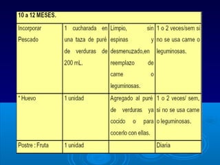 Este documento habla sobre la alimentación complementaria para lactantes, recomendando introducirla a partir de los 6 meses. Explica que para esa edad el niño tiene la madurez fisiológica necesaria. Detalla características como consistencia, aporte nutricional, volumen y temperatura de los alimentos, así como técnicas de preparación. Resalta la importancia de ofrecer una variedad de alimentos para prevenir carencias nutricionales.