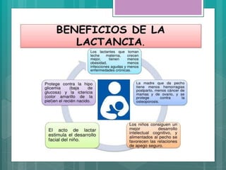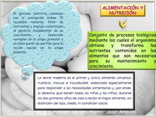 El documento describe los procesos biológicos de la nutrición y la importancia de la lactancia materna en el crecimiento y desarrollo de los recién nacidos, destacando su exclusividad durante los primeros seis meses. Se detallan los tipos de leche materna, sus beneficios tanto para el bebé como para la madre, así como la técnica de lactancia adecuada. Además, enfatiza que la leche de vaca no es apropiada para los lactantes debido a su composición nutricional inadecuada.