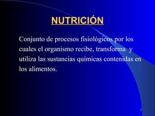 El documento trata sobre nutrición y alimentación. Explica que la nutrición involucra los procesos por los cuales el organismo recibe, transforma y utiliza sustancias de los alimentos, mientras que la alimentación es el acto de ingerir alimentos. Además, destaca que una buena nutrición es fundamental para lograr un estado de salud óptimo.