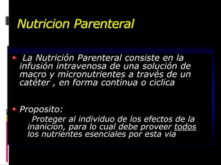 La nutrición parenteral consiste en la infusión intravenosa de soluciones de macronutrientes y micronutrientes a través de un catéter para proveer todos los nutrientes esenciales cuando el tracto gastrointestinal no puede ser utilizado. Requiere el uso de venas de alto flujo y puede tener complicaciones metabólicas e infecciosas si no se administra correctamente.