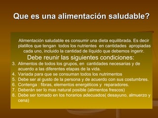 Una alimentación saludable consiste en consumir una dieta equilibrada y variada que contenga todos los nutrientes necesarios en las cantidades adecuadas, incluyendo al menos 2 porciones de frutas y 3 de verduras diarias, carnes blancas y pescado al menos 2 veces por semana, cereales integrales, leche descremada, y evitando las frituras, las grasas saturadas y el exceso de sal. El documento también proporciona ejemplos de menús saludables para el desayuno, almuerzo y cena.