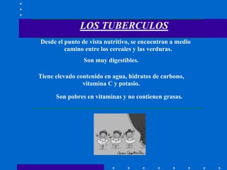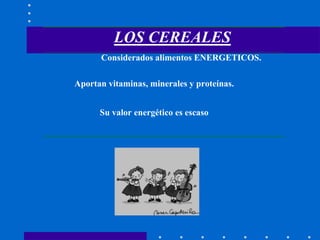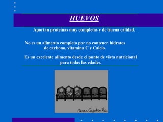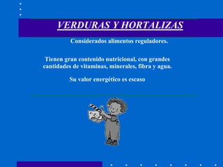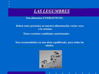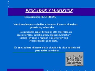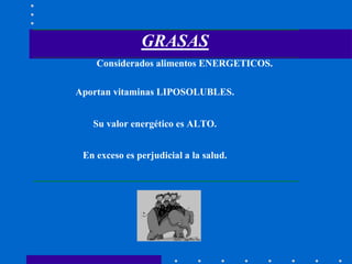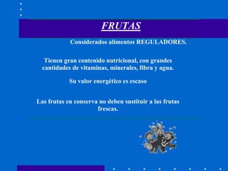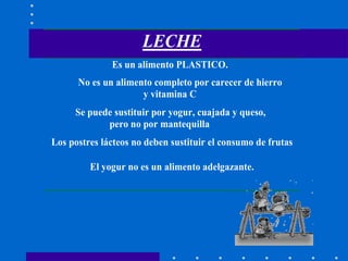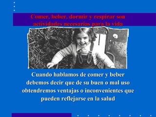 El documento habla sobre una alimentación saludable. Explica que una dieta equilibrada debe ser suficiente, completa, variada y segura. Debe incluir los principales grupos de alimentos como cereales, frutas, verduras, lácteos, carnes y aceites en las cantidades adecuadas según la pirámide alimenticia. También habla sobre la importancia de una buena nutrición en los niños escolares.