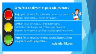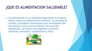 Este documento describe los conceptos clave de una alimentación saludable, incluyendo que consiste en consumir una variedad de alimentos nutritivos como frutas, verduras y granos integrales que proporcionan vitaminas, minerales y otros nutrientes esenciales. También explica que una mala alimentación puede deberse a falta de educación nutricional, hábitos adquiridos o limitaciones de acceso a alimentos, y destaca que seguir una dieta equilibrada y hacer ejercicio regular son claves para mantener una alimentación saludable.