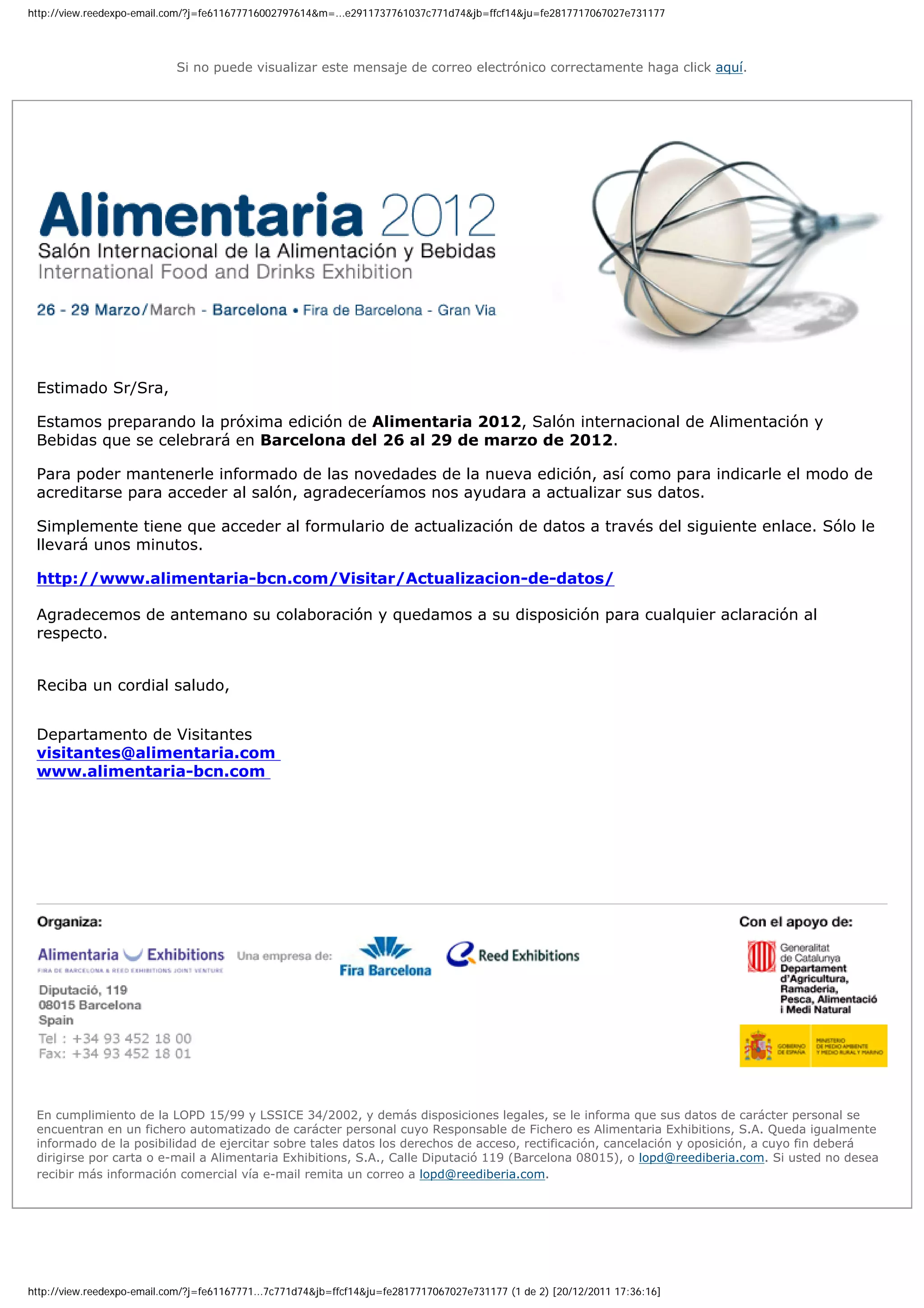 La organización de Alimentaria 2012, el Salón internacional de Alimentación y Bebidas que se celebrará en Barcelona del 26 al 29 de marzo de 2012, solicita actualizar los datos de contacto de los visitantes para mantenerlos informados sobre las novedades del evento y para acreditar su acceso al salón a través de un enlace proporcionado.