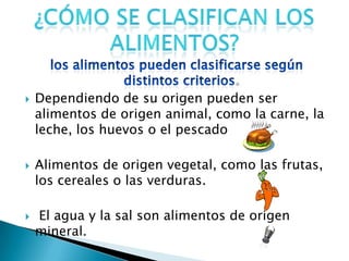 Este documento clasifica los alimentos por su origen y función nutritiva. Los alimentos pueden ser de origen animal, vegetal o mineral. Dependiendo de su función nutritiva, los alimentos son energéticos, constructores o reguladores. Los alimentos energéticos proporcionan energía, los constructores forman tejidos, y los reguladores proveen nutrientes para el funcionamiento del cuerpo.