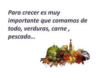 Para crecer sanos, es importante consumir una variedad de alimentos como lácteos, carne, pescado, verduras, fruta, legumbres, cereales y pasta para obtener los nutrientes necesarios.