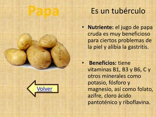 El documento describe los beneficios y nutrientes de varios alimentos. La fresa contiene más vitamina C que los cítricos y ayuda a perder peso. Contiene vitaminas A, E, C, B1, B2, B3, B6 y minerales como potasio y magnesio. La papa tiene vitaminas B1, B3, B6, C y minerales como potasio, fósforo y magnesio. El pollo proporciona proteínas y vitaminas A, B1, B2, B3, B12 y C, así como hierro