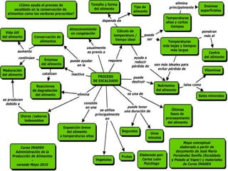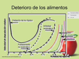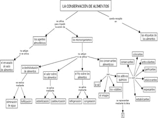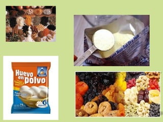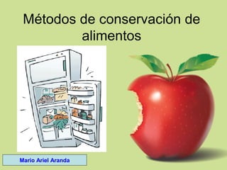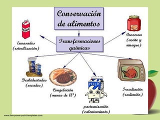 Este documento describe varios métodos de conservación de alimentos, incluyendo procesos térmicos como la pasteurización y esterilización, secado, irradiación, refrigeración y congelación. Explica cómo estos métodos reducen la actividad de agua y destruyen microorganismos para prevenir el deterioro de los alimentos.