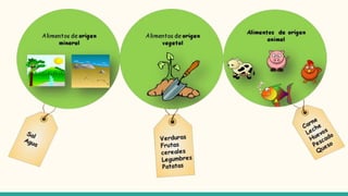 Los alimentos se pueden clasificar de acuerdo a su origen como de origen animal, vegetal o mineral. También se pueden clasificar según su función como alimentos energéticos, constructores o protectores. Los alimentos energéticos proveen energía para actividades físicas, los constructores forman tejidos como la piel y los músculos, y los protectores proveen nutrientes necesarios para que los otros funcionen y mantengan el cuerpo sano.