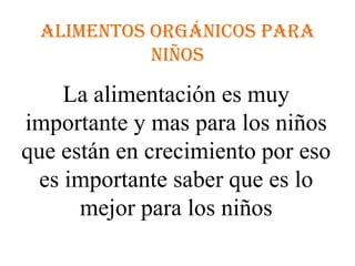 El documento habla sobre la importancia de una buena alimentación para los niños, especialmente alimentos orgánicos. Reconoce que las frutas y verduras son fuentes importantes de vitaminas y otros nutrientes para los niños. También enfatiza la importancia de saber el origen de los alimentos para asegurar una alta calidad sin productos dañinos para los niños. Finalmente, indica que una buena alimentación en la niñez trae buena salud en la adultez.
