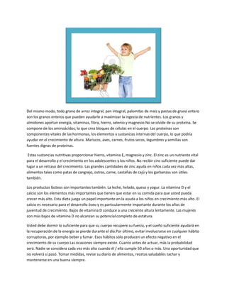 Este documento proporciona consejos sobre una dieta saludable para promover el crecimiento. Recomienda comer regularmente, incluyendo un desayuno balanceado, frutas y verduras ricas en vitaminas, granos integrales, proteínas como pescado y legumbres, y productos lácteos con calcio y vitamina D. También enfatiza dormir adecuadamente y evitar el consumo de alcohol y tabaco, los cuales pueden afectar negativamente el crecimiento.