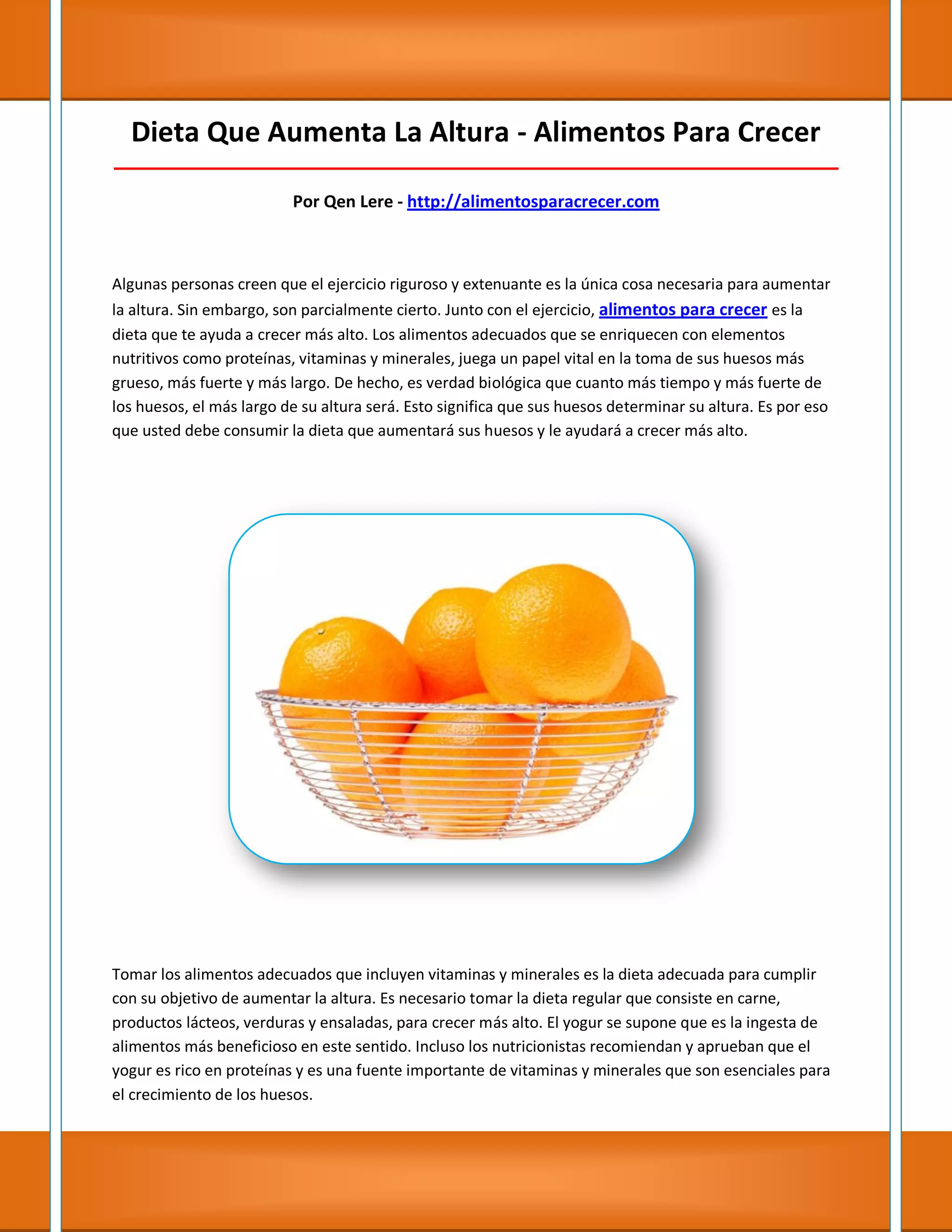 Este documento describe una dieta que puede ayudar a aumentar la altura al consumir alimentos ricos en proteínas, vitaminas y minerales que fortalecen los huesos y promueven el crecimiento. Se recomienda incluir en la dieta carne, productos lácteos, verduras, yogur, y exponerse al sol para obtener vitamina D. También es importante beber mucha agua para distribuir los nutrientes a los huesos y permitir que crezcan más largos, lo que aumenta la altura total.