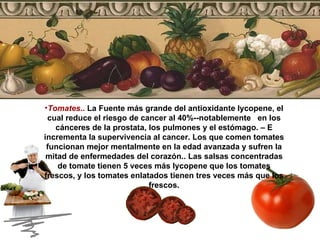 El documento proporciona 10 alimentos que promueven la longevidad: tomates, aceite de oliva, uvas rojas, ajo, espinaca, granos enteros, salmón, nueces, arándanos azules y té. Estos alimentos contienen altos niveles de antioxidantes que reducen el riesgo de cáncer y enfermedades cardíacas, mejoran la salud mental y el funcionamiento cognitivo, y ayudan a prevenir afecciones como la enfermedad de Alzheimer. La investigación muestra que incluir estos alimentos en la