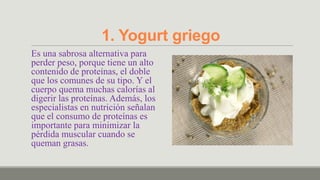 Este documento enumera 14 alimentos que pueden ayudar a quemar grasas. Algunos de estos alimentos son el yogurt griego, la quinoa, la canela, los chiles, el té verde, el pomelo, la sandía, las peras y manzanas, las uvas y pasas de uva, las verduras crudas, el café verde, los huevos, la avena y los cereales integrales. Muchos de estos alimentos contienen proteínas, fibra o compuestos que pueden acelerar el metabolismo y ayudar a controlar el