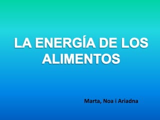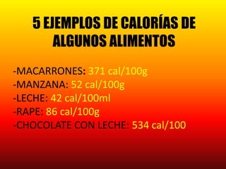 Este documento contiene información sobre calorías de diferentes alimentos como macarrones, manzanas y leche. También describe cinco platos típicos catalanes incluyendo pan con tomate, butifarra con judías blancas, crema catalana, calçots y pan con butifarra junto con sus calorías. Finalmente, detalla el consumo calórico diario recomendado para Noa, Marta y Ariadna y las calorías quemadas en diferentes actividades como dormir, comer y caminar.
