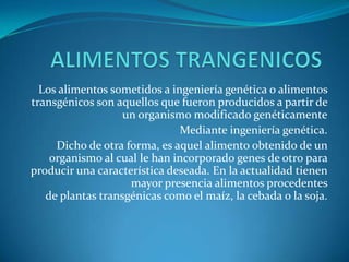 Los alimentos transgénicos son aquellos producidos a partir de organismos modificados genéticamente para producir características deseadas. Los beneficios incluyen mayor productividad e introducción de nuevas cualidades, como resistencia a plagas y herbicidas. La mayoría de cultivos transgénicos son plantas como maíz, soja y cebada. Los cinco mayores productores, Estados Unidos, Brasil, Argentina, Canadá y India, producen el 95% de los alimentos transgénicos mundiales.