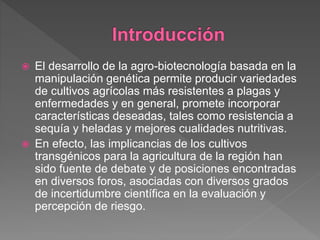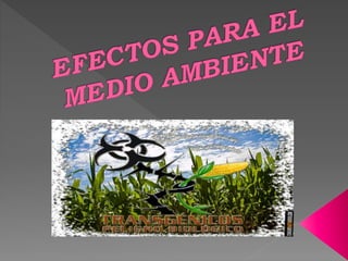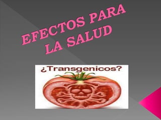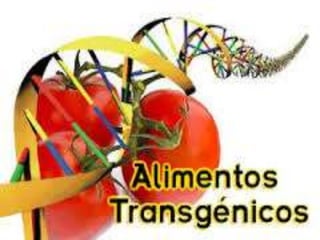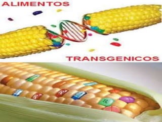 El documento discute los alimentos transgénicos, los cuales son alimentos modificados genéticamente para tener características deseadas como resistencia a plagas, sequía o mejor calidad nutricional. Algunos ejemplos mencionados son tomates y maíz transgénicos. También señala riesgos potenciales para la salud y el medio ambiente asociados con los alimentos transgénicos.