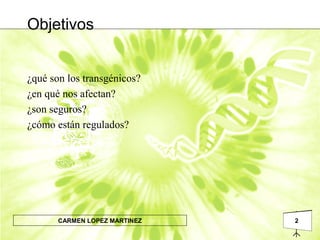 Este documento trata sobre los organismos modificados genéticamente (OMG). Explica que un OMG contiene ADN de otra especie integrado en su propio ADN, dándole nuevas características. Discute los beneficios y riesgos potenciales de los OMG para la salud y el medio ambiente. También describe la regulación de los OMG en la Unión Europea y España, incluyendo la evaluación, etiquetado y rastreabilidad de estos productos.