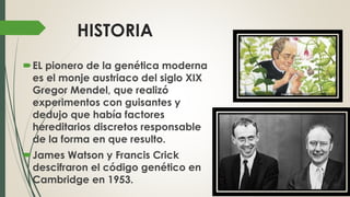 Gregor Mendel realizó experimentos pioneros en genética en el siglo XIX. En 1953, Watson y Crick descifraron el código genético. Los alimentos transgénicos son organismos modificados genéticamente para agregar o suprimir características usando técnicas de ingeniería genética. El maíz Bt es resistente a insectos mediante la introducción de un gen bacteriano, lo que reduce el uso de pesticidas.