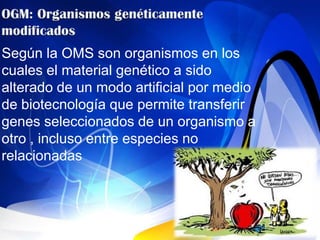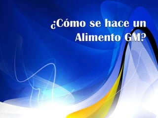 Este documento resume la historia y desarrollo de los alimentos transgénicos. Explica cómo se transfieren genes entre organismos usando técnicas como Agrobacterium y biolística. También discute los debates en torno a la seguridad de los alimentos transgénicos, incluyendo la alergenicidad y la transferencia de genes. Finalmente, resume la regulación internacional y mexicana de los alimentos modificados genéticamente.