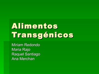 Este documento trata sobre los alimentos transgénicos. Explica que son organismos a los que se les han incorporado genes de otras especies para producir características deseadas. Describe brevemente los orígenes e historia de los alimentos transgénicos, el proceso de su creación e incluye ejemplos como la soja y el maíz resistentes. También menciona algunos de sus potenciales beneficios y riesgos.